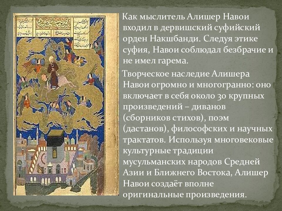 Как мыслитель Алишер Навои входил в дервишский суфийский орден Накшбанди. Следуя этике суфия, Навои соблюдал безбрачие и не имел гарема. Творческое наследие Алишера Навои огромно и многогранно: оно включает в себя около 30 крупных произведений – диванов (сборников стихов), поэм ( дастанов ), философских и научных трактатов. Используя многовековые культурные традиции мусульманских народов Средней Азии и Ближнего Востока, Алишер Навои создаёт вполне оригинальные произведения.