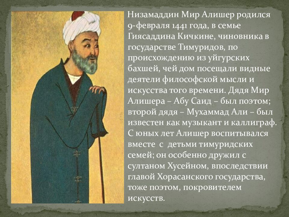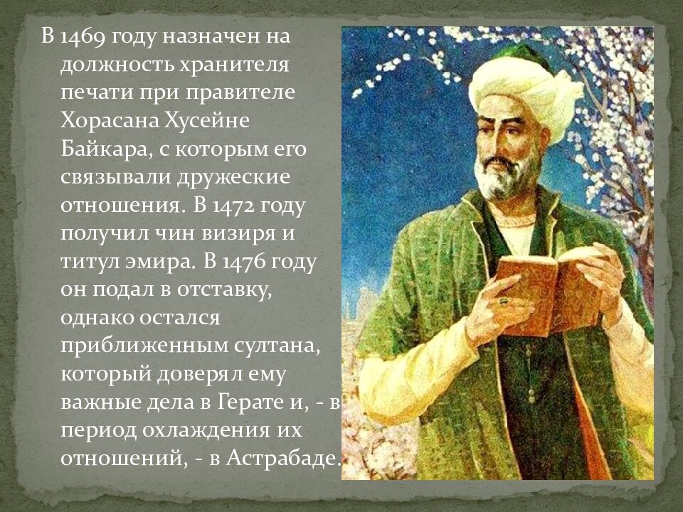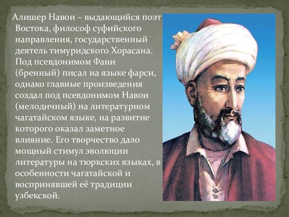 Алишер Навои – выдающийся поэт Востока, философ суфийского направления, государственный деятель тимуридского Хорасана. Под псевдонимом Фани (бренный) писал на языке фарси, однако главные произведения создал под псевдонимом Навои (мелодичный) на литературном чагатайском языке, на развитие которого оказал заметное влияние. Его творчество дало мощный стимул эволюции литературы на тюркских языках, в особенности чагатайской и воспринявшей её традиции узбекской.