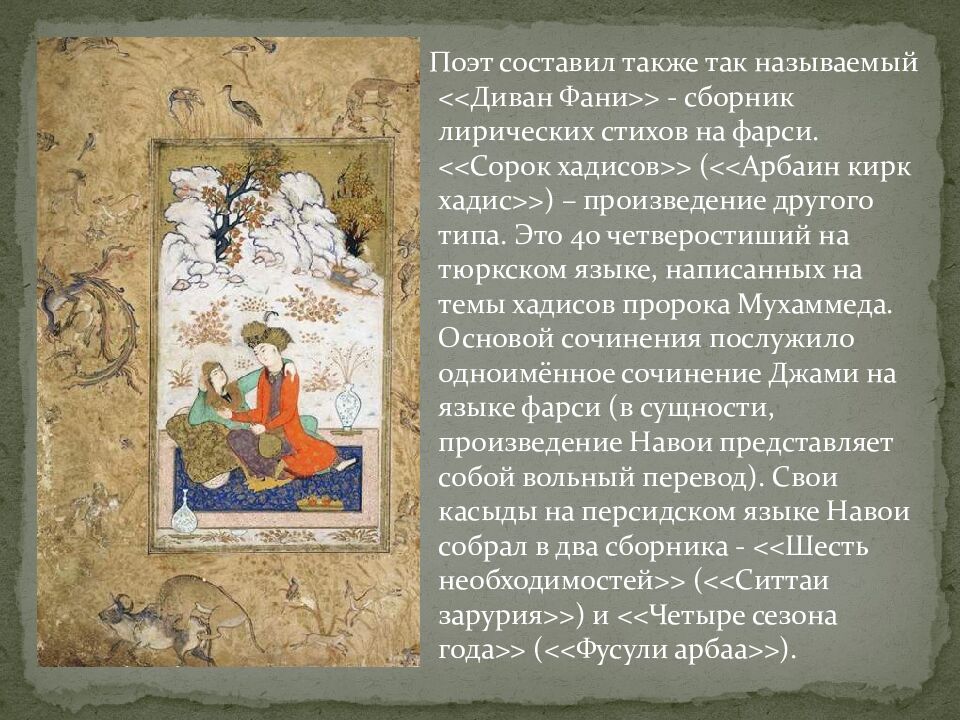 Поэт составил также так называемый << Диван Фани >> - сборник лирических стихов на фарси. << Сорок хадисов >> ( << Арбаин кирк хадис >> ) – произведение другого типа. Это 40 четверостиший на тюркском языке, написанных на темы хадисов пророка Мухаммеда. Основой сочинения послужило одноимённое сочинение Джами на языке фарси (в сущности, произведение Навои представляет собой вольный перевод). Свои касыды на персидском языке Навои собрал в два сборника - << Шесть необходимостей >> ( << Ситтаи зарурия >> ) и << Четыре сезона года >> ( << Фусули арбаа >> ).