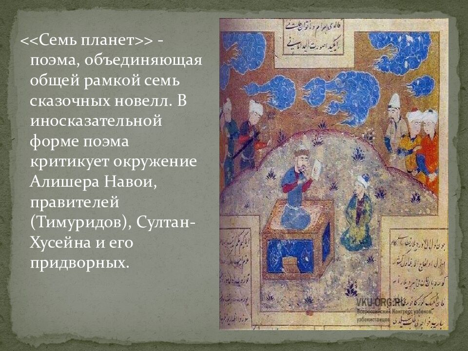 << Семь планет >> - поэма, объединяющая общей рамкой семь сказочных новелл. В иносказательной форме поэма критикует окружение Алишера Навои, правителей ( Тимуридов ), Султан-Хусейна и его придворных.