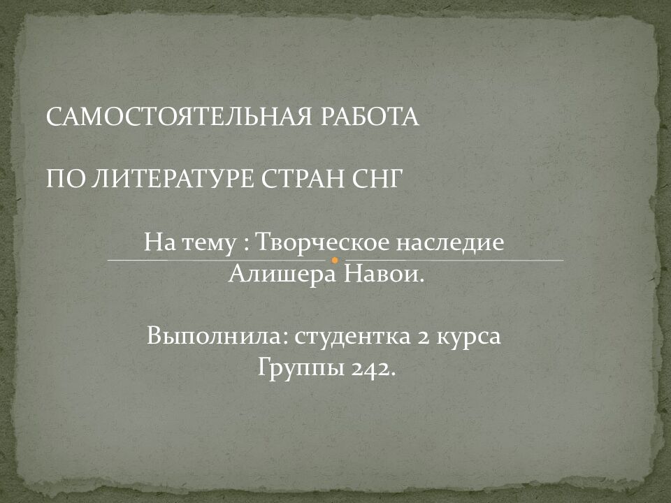 САМОСТОЯТЕЛЬНАЯ РАБОТА ПО ЛИТЕРАТУРЕ СТРАН СНГ На тему : Творческое наследие Алишера Навои. Выполнила: студентка 2 курса Группы 242.