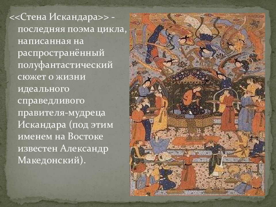 << Стена Искандара >> - последняя поэма цикла, написанная на распространённый полуфантастический сюжет о жизни идеального справедливого правителя-мудреца Искандара (под этим именем на Востоке известен Александр Македонский).