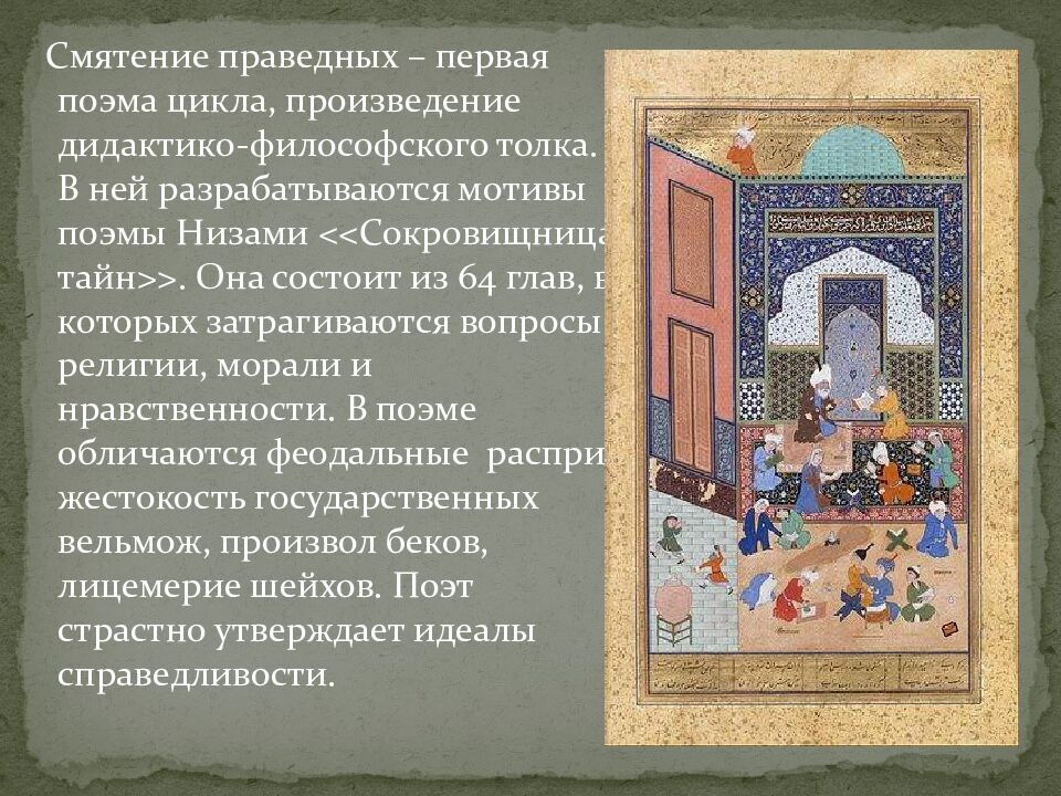 Смятение праведных – первая поэма цикла, произведение дидактико-философского толка. В ней разрабатываются мотивы поэмы Низами << Сокровищница тайн >>. Она состоит из 64 глав, в которых затрагиваются вопросы религии, морали и нравственности. В поэме обличаются феодальные распри, жестокость государственных вельмож, произвол беков, лицемерие шейхов. Поэт страстно утверждает идеалы справедливости.