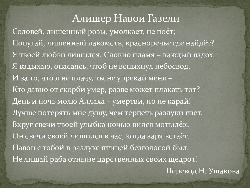Алишер Навои Газели Соловей, лишенный розы, умолкает, не поёт; Попугай, лишенный лакомств, красноречье где найдёт? Я твоей любви лишился. Словно пламя – каждый вздох. Я вздыхаю, опасаясь, чтоб не вспыхнул небосвод. И за то, что я не плачу, ты не упрекай меня – Кто давно от скорби умер, разве может плакать тот? День и ночь молю Аллаха – умертви, но не карай! Лучше потерять мне душу, чем терпеть разлуки гнет. Вкруг свечи твоей улыбка ночью вился мотылёк, Он свечи своей лишился в час, когда заря встаёт. Навои с тобой в разлуке птицей безголосой был. Не лишай раба отныне царственных своих щедрот! Перевод Н. Ушакова
