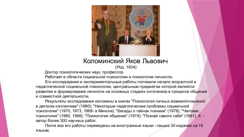 Коломинский Яков Львович (Род. 1934) Доктор психологических наук, профессор. Работает в области социальной психологии и психологии личности. Его исследования и экспериментальные работы положили начало возрастной и педагогической социальной психологии, центральным предметом которой является развитие и формирование личности на основных стадиях онтогенеза в процессе общений и совместной деятельности. Результаты исследования изложены в книгах "Психология личных взаимоотношений в детском коллективе" (1960); "Некоторые педагогические проблемы социальной психологии" (1970, 1973, 1988- в Минске); "Беседы о тайнах психики" (1976); "Человек: психология" (1980, 1986); "Психология общения" (1974); "Познай самого себя" (1981). К. - автор более 300 научных работ. Почти все его работы переведены на иностранные языки - свыше 30 изданий на 15 языках.