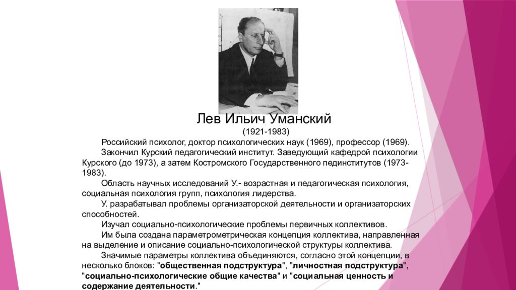 Лев Ильич Уманский (1921-1983) Российский психолог, доктор психологических наук (1969), профессор (1969). Закончил Куpский педагогический институт. Заведующий кафедрой психологии Куpского (до 1973), а затем Костpомского Государственного пединститутов (1973-1983). Область научных исследований У.- возрастная и педагогическая психология, социальная психология групп, психология лидерства. У. разрабатывал проблемы организаторской деятельности и организаторских способностей. Изучал социально-психологические проблемы первичных коллективов. Им была создана параметрометpическая концепция коллектива, направленная на выделение и описание социально-психологической структуры коллектива. Значимые параметры коллектива объединяются, согласно этой концепции, в несколько блоков: " общественная подстpуктуpа ", " личностная подстpуктуpа ", " социально-психологические общие качества " и " социальная ценность и содержание деятельности."