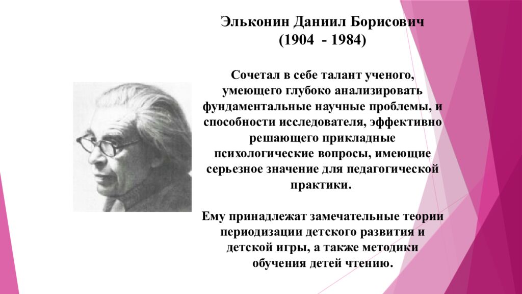 Эльконин Даниил Борисович (1904 - 1984) C очетал в себе талант ученого, умеющего глубоко анализировать фундаментальные научные проблемы, и способности исследователя, эффективно решающего прикладные психологические вопросы, имеющие серьезное значение для педагогической практики. Ему принадлежат замечательные теории периодизации детского развития и детской игры, а также методики обучения детей чтению.