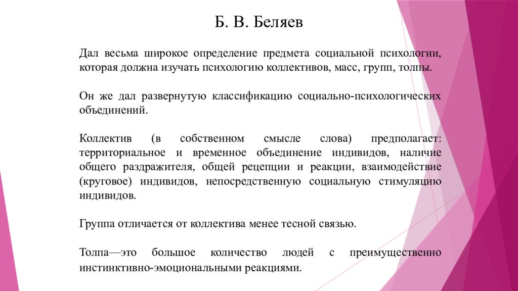 Б. В. Беляев Дал весьма широкое определение предмета социальной психологии, которая должна изучать психологию коллективов, масс, групп, толпы. Он же дал развернутую классификацию социально-психологических объединений. Коллектив (в собственном смысле слова) предполагает: территориальное и временное объединение индивидов, наличие общего раздражителя, общей рецепции и реакции, взаимодействие (круговое) индивидов, непосредственную социальную стимуляцию индивидов. Группа отличается от коллектива менее тесной связью. Толпа—это большое количество людей с преимущественно инстинктивно-эмоциональными реакциями.