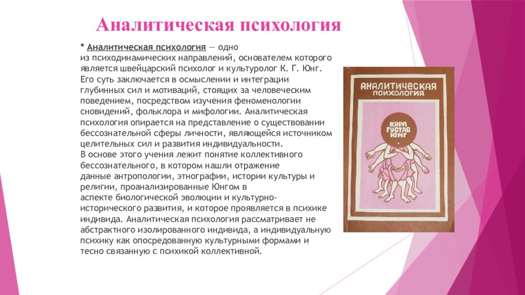 * Аналитическая психология — одно из психодинамических направлений, основателем которого является швейцарский психолог и культуролог К. Г. Юнг. Его суть заключается в осмыслении и интеграции глубинных сил и мотиваций, стоящих за человеческим поведением, посредством изучения феноменологии сновидений, фольклора и мифологии. Аналитическая психология опирается на представление о существовании бессознательной сферы личности, являющейся источником целительных сил и развития индивидуальности. В основе этого учения лежит понятие коллективного бессознательного, в котором нашли отражение данные антропологии, этнографии, истории культуры и религии, проанализированные Юнгом в аспекте биологической эволюции и культурно-исторического развития, и которое проявляется в психике индивида. Аналитическая психология рассматривает не абстрактного изолированного индивида, а индивидуальную психику как опосредованную культурными формами и тесно связанную с психикой коллективной.