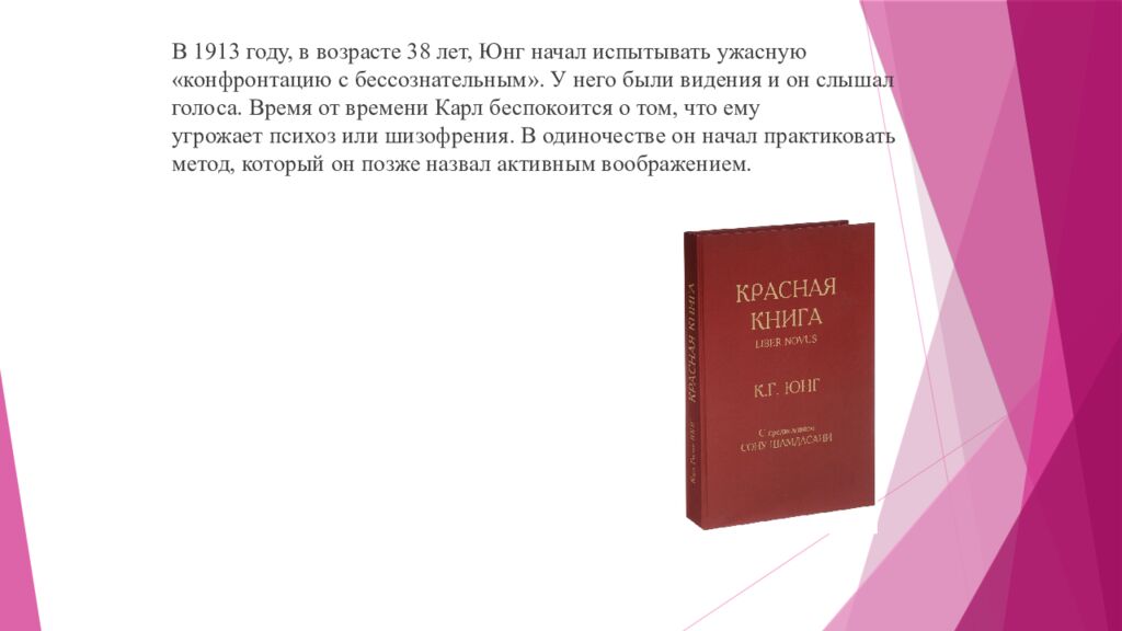 В 1913 году, в возрасте 38 лет, Юнг начал испытывать ужасную «конфронтацию с бессознательным». У него были видения и он слышал голоса. Время от времени Карл беспокоится о том, что ему угрожает психоз или шизофрения. В одиночестве он начал практиковать метод, который он позже назвал активным воображением. Юнг записывал все, что он чувствовал или видел в небольших дневниках. Затем он начал переписывать эти заметки в большую книгу, переплетённую красной кожей, над которой он работал с перерывами в течение 16 лет.