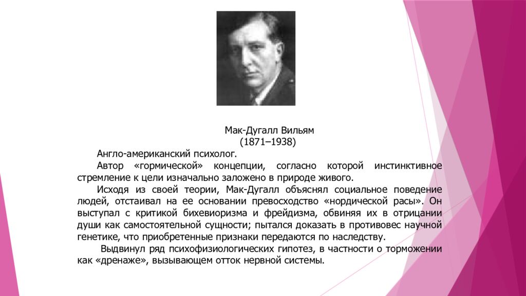 Мак-Дугалл Вильям (1871–1938) Англо-американский психолог. Автор «гормической» концепции, согласно которой инстинктивное стремление к цели изначально заложено в природе живого. Исходя из своей теории, Мак-Дугалл объяснял социальное поведение людей, отстаивал на ее основании превосходство «нордической расы». Он выступал с критикой бихевиоризма и фрейдизма, обвиняя их в отрицании души как самостоятельной сущности; пытался доказать в противовес научной генетике, что приобретенные признаки передаются по наследству. Выдвинул ряд психофизиологических гипотез, в частности о торможении как «дренаже», вызывающем отток нервной системы.