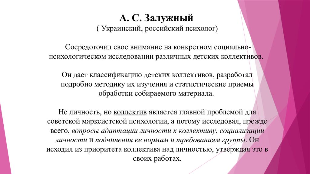 А. С. Залужный ( Украинский, российский психолог) Сосредоточил свое внимание на конкретном социально-психологическом исследовании различных детских коллективов. Он дает классификацию детских коллективов, разработал подробно методику их изучения и статистические приемы обработки собираемого материала. Не личность, но коллектив является главной проблемой для советской марксистской психологии, а потому исследовал, прежде всего, вопросы адаптации личности к коллективу, социализации личности и подчинения ее нормам и требованиям группы. Он исходил из приоритета коллектива над личностью, утверждая это в своих работах.