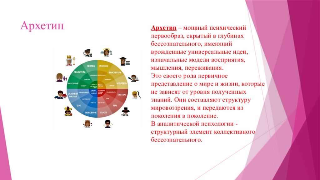 Архетип – мощный психический первообраз, скрытый в глубинах бессознательного, имеющий врожденные универсальные идеи, изначальные модели восприятия, мышления, переживания. Это своего рода первичное представление о мире и жизни, которые не зависят от уровня полученных знаний. Они составляют структуру мировоззрения, и передаются из поколения в поколение. В аналитической психологии - структурный элемент коллективного бессознательного.