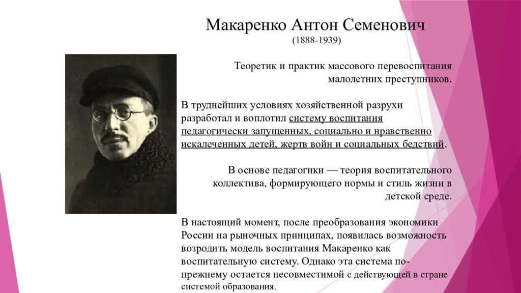 Макаренко Антон Семенович (1888-1939) Теоретик и практик массового перевоспитания малолетних преступников. В труднейших условиях хозяйственной разрухи разработал и воплотил систему воспитания педагогически запущенных, социально и нравственно искалеченных детей, жертв войн и социальных бедствий. В основе педагогики — теория воспитательного коллектива, формирующего нормы и стиль жизни в детской среде. В настоящий момент, после преобразования экономики России на рыночных принципах, появилась возможность возродить модель воспитания Макаренко как воспитательную систему. Однако эта система по-прежнему остается несовместимой с действующей в стране системой образования.