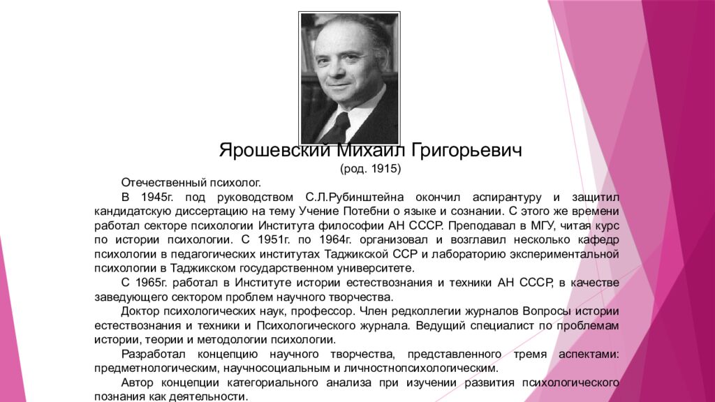 Ярошевский Михаил Григорьевич (род. 1915) Отечественный психолог. В 1945г. под руководством С.Л.Рубинштейна окончил аспирантуру и защитил кандидатскую диссертацию на тему Учение Потебни о языке и сознании. С этого же времени работал секторе психологии Института философии АН СССР. Преподавал в МГУ, читая курс по истории психологии. С 1951г. по 1964г. организовал и возглавил несколько кафедр психологии в педагогических институтах Таджикской ССР и лабораторию экспериментальной психологии в Таджикском государственном университете. С 1965г. работал в Институте истории естествознания и техники АН СССР, в качестве заведующего сектором проблем научного творчества. Доктор психологических наук, профессор. Член редколлегии журналов Вопросы истории естествознания и техники и Психологического журнала. Ведущий специалист по проблемам истории, теории и методологии психологии. Разработал концепцию научного творчества, представленного тремя аспектами: предметнологическим, научносоциальным и личностнопсихологическим. Автор концепции категориального анализа при изучении развития психологического познания как деятельности.