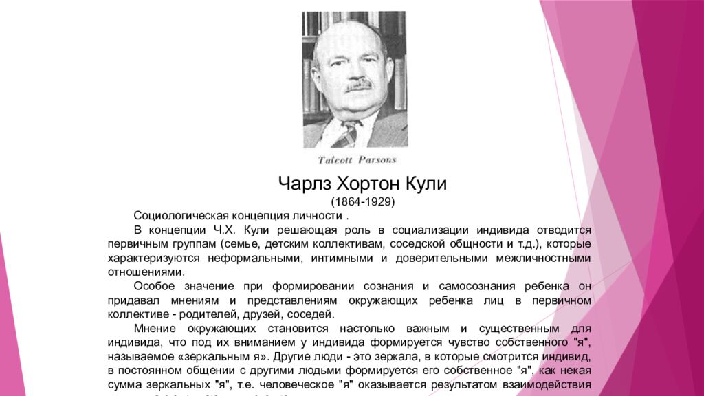 Чарлз Хортон Кули (1864-1929) Социологическая концепция личности. В концепции Ч.Х. Кули решающая роль в социализации индивида отводится первичным группам (семье, детским коллективам, соседской общности и т.д.), которые характеризуются неформальными, интимными и доверительными межличностными отношениями. Особое значение при формировании сознания и самосознания ребенка он придавал мнениям и представлениям окружающих ребенка лиц в первичном коллективе - родителей, друзей, соседей. Мнение окружающих становится настолько важным и существенным для индивида, что под их вниманием у индивида формируется чувство собственного "я", называемое «зеркальным я». Другие люди - это зеркала, в которые смотрится индивид, в постоянном общении с другими людьми формируется его собственное "я", как некая сумма зеркальных "я", т.е. человеческое "я" оказывается результатом взаимодействия индивида с окружающими его людьми.