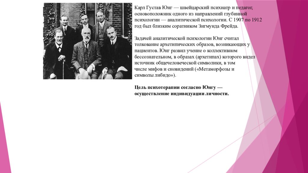 Карл Густав Юнг — швейцарский психиатр и педагог, основоположник одного из направлений глубинной психологии — аналитической психологии. С 1907 по 1912 год был близким соратником Зигмунда Фрейда. Задачей аналитической психологии Юнг считал толкование архетипических образов, возникающих у пациентов. Юнг развил учение о коллективном бессознательном, в образах (архетипах) которого видел источник общечеловеческой символики, в том числе мифов и сновидений («Метаморфозы и символы либидо»). Цель психотерапии согласно Юнгу — осуществление индивидуации личности. В 1895 году Юнг начал изучать медицину в Базельском университете. В 1900 году начал работать в психиатрической клинике Bürgholz в Цюрихе в качестве ассистента Эйгена Блейлера. В то время Блейлер уже общался с австрийским неврологом Зигмундом Фрейдом.