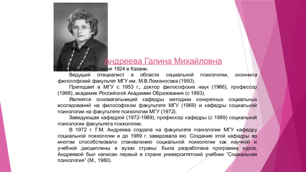 Андреева Галина Михайловна Родилась 13 июня 1924 в Казани. Ведущий специалист в области социальной психологии, окончила философский факультет МГУ им. М.В.Ломоносова (1950). Преподает в МГУ с 1953 г., доктор философских наук (1966), профессор (1968), академик Российской Академии Образования (с 1993). Является основательницей кафедры методики конкретных социальных исследований на философском факультете МГУ (1969) и кафедры социальной психологии на факультете психологии МГУ (1972). Заведующая кафедрой (1972-1989), профессор кафедры (с 1989) социальной психологии факультета психологии. В 1972 г. Г.М. Андреева создала на факультете психологии МГУ кафедру социальной психологии и до 1989 г. заведовала ею. Создание этой кафедры во многом способствовало становлению социальной психологии как научной и учебной дисциплины в вузах страны: была разработана программа курса, Андреевой был написан первый в стране университетский учебник “Социальная психология” (М., 1980).