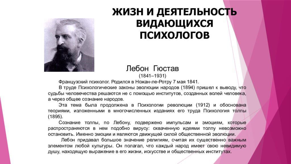Лебон Гюстав (1841–1931) Французский психолог. Родился в Ножан-ле-Ротру 7 мая 1841. В труде Психологические законы эволюции народов (1894) пришел к выводу, что судьбы человечества решаются не с помощью институтов, созданных волей человека, а через общее сознание народов. Эта тема была продолжена в Психологии революции (1912) и обоснована теориями, изложенными в многочисленных изданиях его труда Психология толпы (1895). Сознание толпы, по Лебону, подвержено импульсам и эмоциям, которые распространяются в нем подобно вирусу: охваченную идеями толпу невозможно остановить. Именно эмоции и являются движущей силой общественной эволюции. Лебон придавал большое значение религиям, считая их существенно важным элементом любой культуры. Он полагал, что каждый народ имеет свою невидимую душу, находящую выражение в его жизни, искусстве и общественных институтах. ЖИЗН И ДЕЯТЕЛЬНОСТЬ ВИДАЮЩИХСЯ ПСИХОЛОГОВ