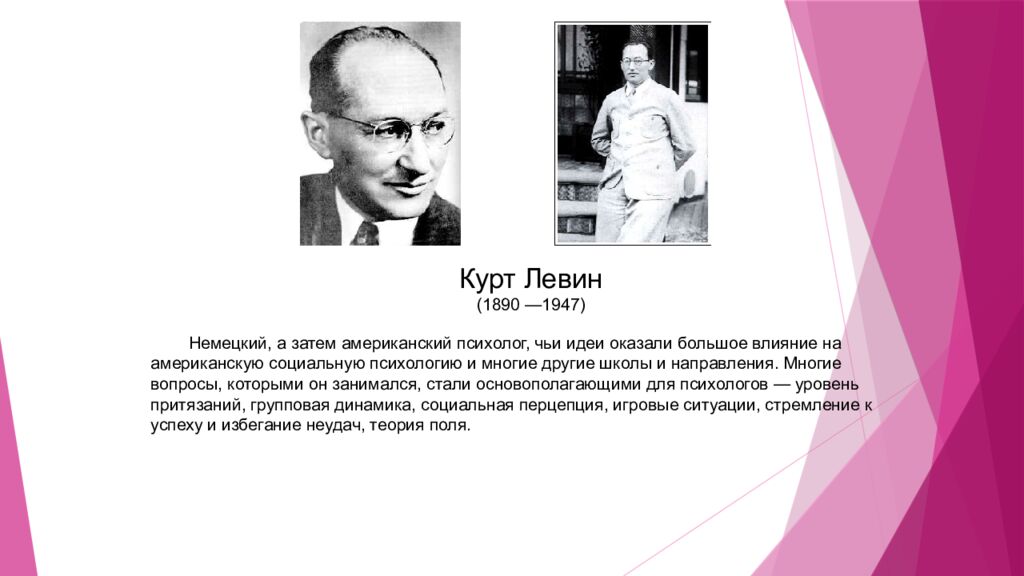 Курт Левин (1890 —1947) Немецкий, а затем американский психолог, чьи идеи оказали большое влияние на американскую социальную психологию и многие другие школы и направления. Многие вопросы, которыми он занимался, стали основополагающими для психологов — уровень притязаний, групповая динамика, социальная перцепция, игровые ситуации, стремление к успеху и избегание неудач, теория поля.