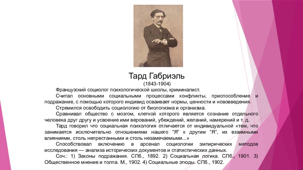 Тард Габриэль (1843-1904) Французский социолог психологической школы, криминалист. Считал основными социальными процессами конфликты, приспособление и подражание, с помощью которого индивид осваивает нормы, ценности и нововведения. Стремился освободить социологию от биологизма и организма. Сравнивал общество с мозгом, клеткой которого является сознание отдельного человека друг другу и усвоение ими верований, убеждений, желаний, намерений и т. д. Тард говорил что социальная психология отличается от индивидуальной «тем, что занимается исключительно отношениями нашего “Я” к другим “Я”, их взаимными влияниями, столь непрестанными и столь незамечаемыми...» Способствовал включению в арсенал социологии эмпирических методов исследования — анализа исторических документов и статистических данных. Соч.: 1) Законы подражания. СПб., 1892. 2) Социальная логика. СПб., 1901. 3) Общественное мнение и толпа. М., 1902. 4) Социальные этюды. СПб., 1902.