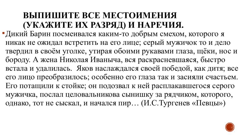 Слайд 5: Выпишите все местоимения (укажите их разряд) и наречия