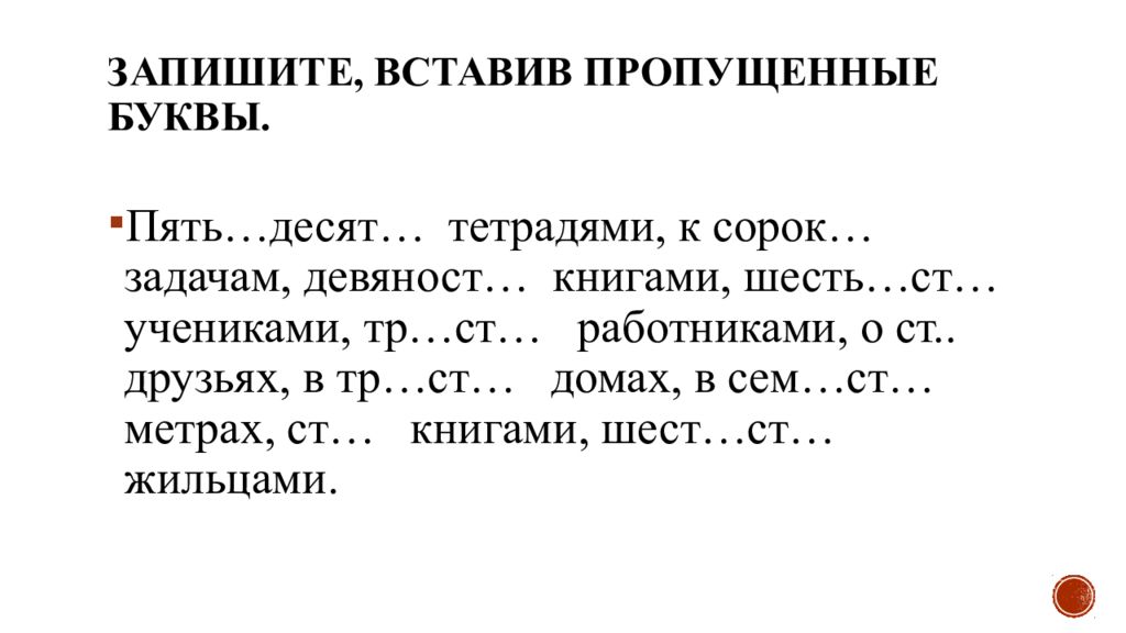 Пять… десят … тетрадями, к сорок… задачам, девяност … книгами, шесть… ст … учениками, тр … ст … работниками, о ст.. друзьях, в тр … ст … домах, в сем… ст … метрах, ст … книгами, шест… ст … жильцами.
