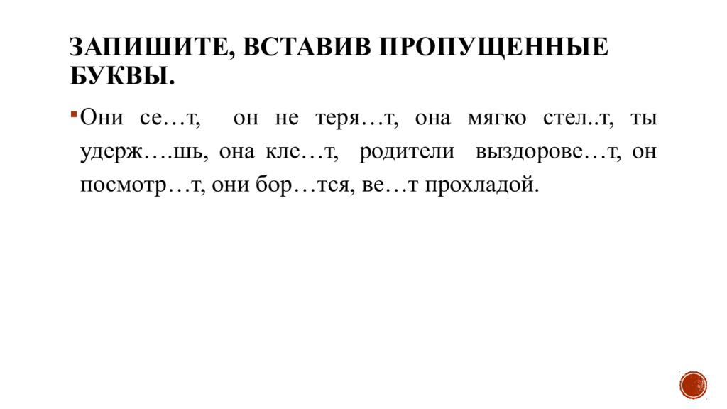 Они се…т, он не теря …т, она мягко стел..т, ты удерж …. шь, она кле …т, родители выздорове …т, он посмотр …т, они бор… тся, ве …т прохладой.