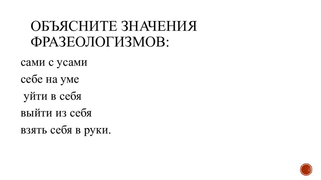Последний слайд презентации: САМОСТОЯТЕЛЬНЫЕ ЧАСТИ РЕЧИ. ПРОВЕРОЧНАЯ РАБОТА: Объясните значения фразеологизмов: