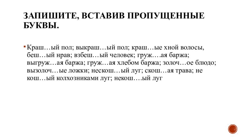Краш … ый пол; выкраш … ый пол; краш … ые хной волосы, беш … ый нрав; взбеш … ый человек; груж …. ая баржа; выгруж … ая баржа; груж … ая хлебом баржа; золоч … ое блюдо; вызолоч … ые ложки; нескош … ый луг; скош … ая трава; не кош… ый колхозниками луг; некош …. ый луг