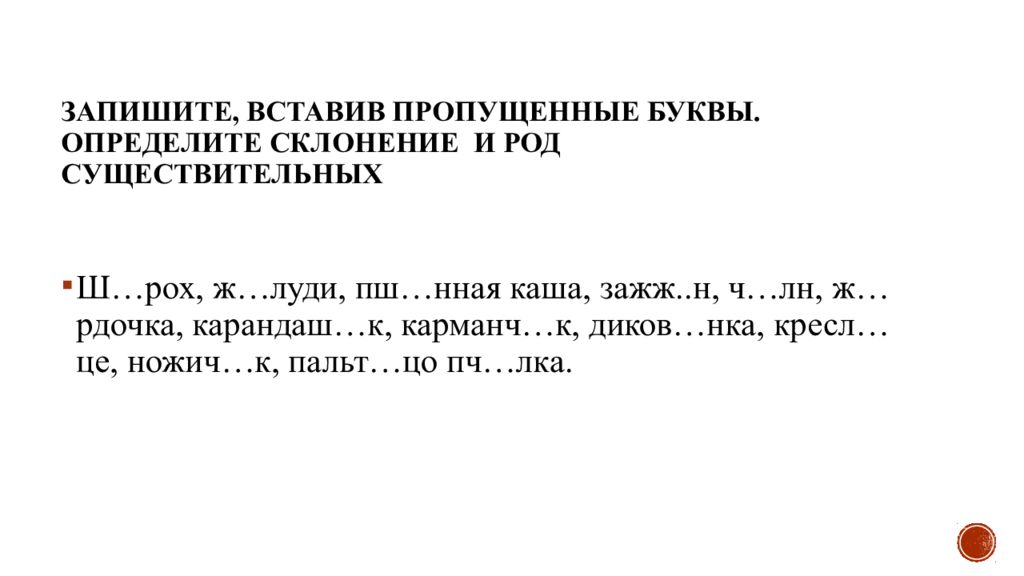 Ш… рох, ж…луди, пш … нная каша, зажж..н, ч… лн, ж… рдочка, карандаш…к, карманч …к, диков … нка, кресл … це, ножич …к, пальт … цо пч … лка.