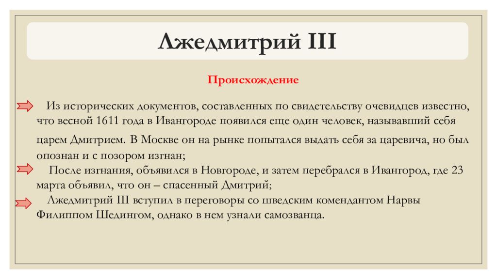 Происхождение Из исторических документов, составленных по свидетельству очевидцев известно, что веснои ̆ 1611 года в Ивангороде появился еще один человек, называвшии ̆ себя царем Дмитрием. В Москве он на рынке попытался выдать себя за царевича, но был опознан и с позором изгнан; После изгнания, объявился в Новгороде, и затем перебрался в Ивангород, где 23 марта объявил, что он – спасенныи ̆ Дмитрии ̆; Лжедмитрий III вступил в переговоры со шведским комендантом Нарвы Филиппом Шедингом, однако в нем узнали самозванца.