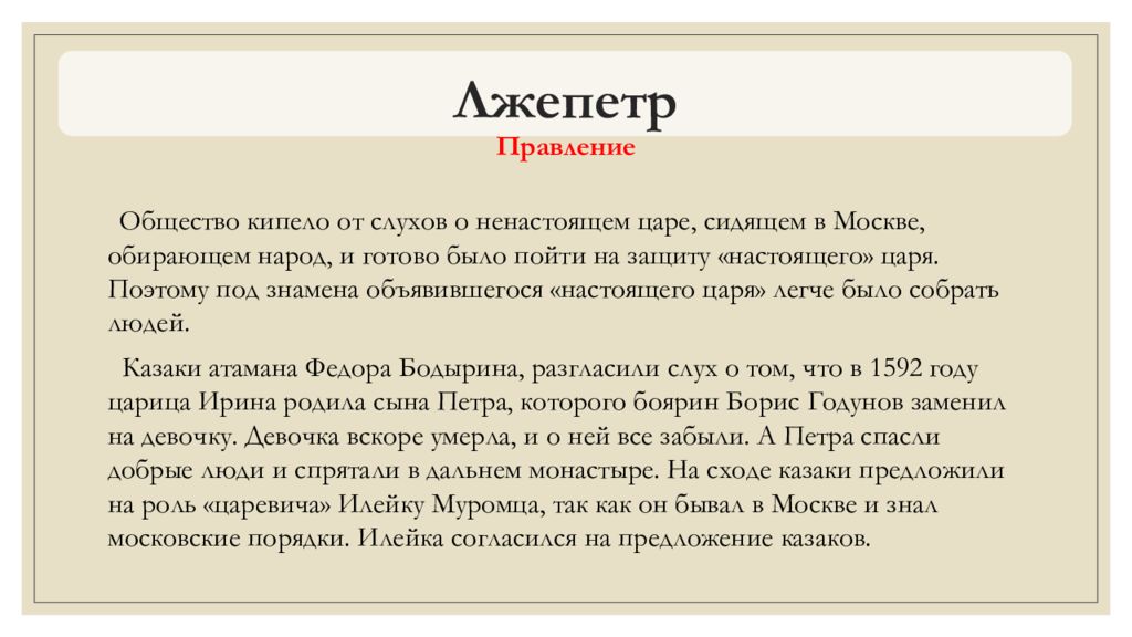 Общество кипело от слухов о ненастоящем царе, сидящем в Москве, обирающем народ, и готово было пойти на защиту «настоящего» царя. Поэтому под знамена объявившегося «настоящего царя» легче было собрать людеи ̆. Казаки атамана Федора Бодырина, разгласили слух о том, что в 1592 году царица Ирина родила сына Петра, которого боярин Борис Годунов заменил на девочку. Девочка вскоре умерла, и о неи ̆ все забыли. А Петра спасли добрые люди и спрятали в дальнем монастыре. На сходе казаки предложили на роль «царевича» Илейку Муромца, так как он бывал в Москве и знал московские порядки. Илейка согласился на предложение казаков.
