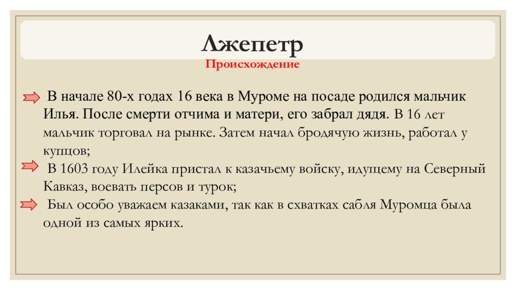 В начале 80-х годах 16 века в Муроме на посаде родился мальчик Илья. После смерти отчима и матери, его забрал дядя. В 16 лет мальчик торговал на рынке. Затем начал бродячую жизнь, работал у купцов; В 1603 году Илейка пристал к казачьему войску, идущему на Северныи ̆ Кавказ, воевать персов и турок; Был особо уважаем казаками, так как в схватках сабля Муромца была одной из самых ярких.