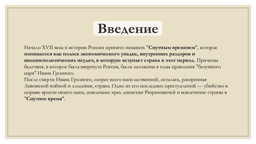 Начало XVII века в истории России принято называть " Смутным временем ", которое понимается как полоса экономического упадка, внутренних раздоров и внешнеполитических неудач, в которую вступает страна в этот период. Причины бедствия, в которое была ввергнута Россия, были заложены в годы правления "безумного царя" Ивана Грозного. После смерти Ивана Грозного, скорее всего насильственной, осталась, разоренная Ливонской войной и злодеями, страна. Одно из его последних преступлений — убийство в порыве ярости своего сына, повлекшее крах династии Рюриковичей и вовлечение страны в " Смутное время ".