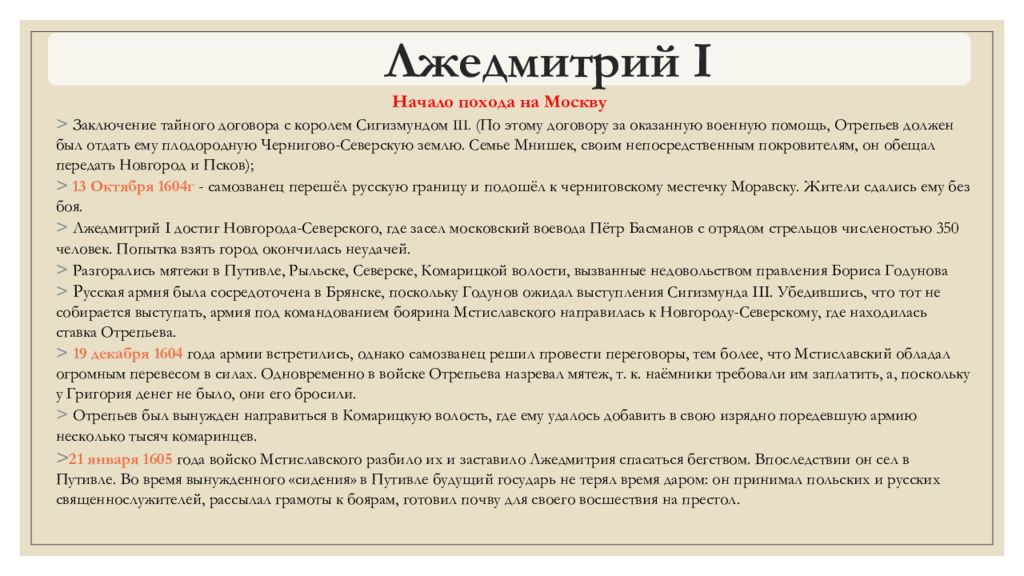 Начало похода на Москву > Заключение тайного договора с королем Сигизмундом III. (По этому договору за оказанную военную помощь, Отрепьев должен был отдать ему плодородную Чернигово-Северскую землю. Семье Мнишек, своим непосредственным покровителям, он обещал передать Новгород и Псков); > 13 Октября 1604г - самозванец перешёл русскую границу и подошёл к черниговскому местечку Моравску. Жители сдались ему без боя. > Лжедмитрий I достиг Новгорода-Северского, где засел московский воевода Пётр Басманов с отрядом стрельцов численостью 350 человек. Попытка взять город окончилась неудачей. > Разгорались мятежи в Путивле, Рыльске, Северске, Комарицкой волости, вызванные недовольством правления Бориса Годунова > Р усская армия была сосредоточена в Брянске, поскольку Годунов ожидал выступления Сигизмунда III. Убедившись, что тот не собирается выступать, армия под командованием боярина Мстиславского направилась к Новгороду-Северскому, где находилась ставка Отрепьева. > 19 декабря 1604 года армии встретились, однако самозванец решил провести переговоры, тем более, что Мстиславский обладал огромным перевесом в силах. Одновременно в войске Отрепьева назревал мятеж, т. к. наёмники требовали им заплатить, а, поскольку у Григория денег не было, они его бросили. > Отрепьев был вынужден направиться в Комарицкую волость, где ему удалось добавить в свою изрядно поредевшую армию несколько тысяч комаринцев. > 21 января 1605 года войско Мстиславского разбило их и заставило Лжедмитрия спасаться бегством. Впоследствии он сел в Путивле. Во время вынужденного «сидения» в Путивле будущий государь не терял время даром: он принимал польских и русских священнослужителей, рассылал грамоты к боярам, готовил почву для своего восшествия на престол.