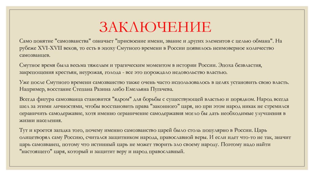 Само понятие "самозванства" означает "присвоение имени, звание и других элементов с целью обмана". На рубеже XVI-XVII веков, то есть в эпоху Смутного времени в России появилось неимоверное количество самозванцев. Смутное время была весьма тяжелым и трагическим моментом в истории России. Эпоха безвластия, закрепощения крестьян, неурожая, голода - все это порождало недовольство властью. Уже после Смутного времени самозванство также очень часто использовалось в целях установить свою власть. Например, восстание Степана Разина либо Емельяна Пугачева. Всегда фигура самозванца становится "ядром" для борьбы с существующей властью и порядком. Народ всегда шел за этими личностями, чтобы восстановить права "законного" царя, но при этом народ никак не стремился ограничить самодержавие, хотя именно ограничение самодержавия могло бы дать необходимые улучшения в жизни населения. Тут и кроется загадка того, почему именно самозванство царей было столь популярно в России. Царь олицетворял саму Россию, считался защитником народа, православной веры. И если идет что-то не так, значит царь самозванец, потому что истинный царь не может творить зло своему народу. Поэтому надо найти "настоящего" царя, который и защитит веру и народ православный.