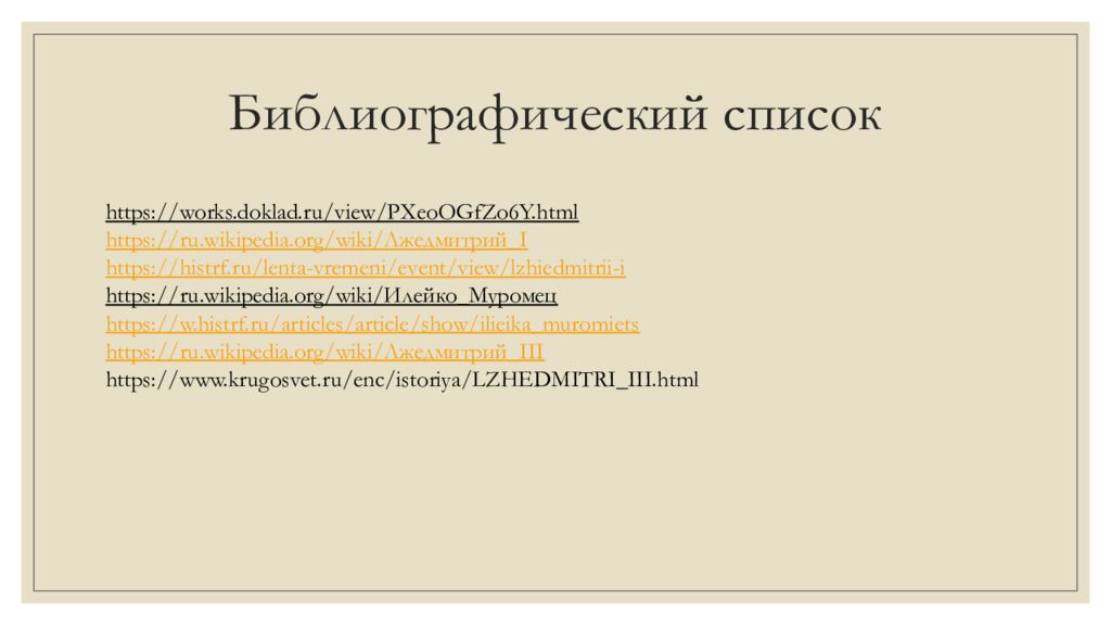 https://works.doklad.ru/view/PXeoOGfZo6Y.html https://ru.wikipedia.org/wiki/Лжедмитрий_I https://histrf.ru/lenta-vremeni/event/view/lzhiedmitrii-i https://ru.wikipedia.org/wiki/Илейко_Муромец https://w.histrf.ru/articles/article/show/ilieika_muromiets https://ru.wikipedia.org/wiki/Лжедмитрий_III https :// www.krugosvet.ru / enc / istoriya / LZHEDMITRI_III.html