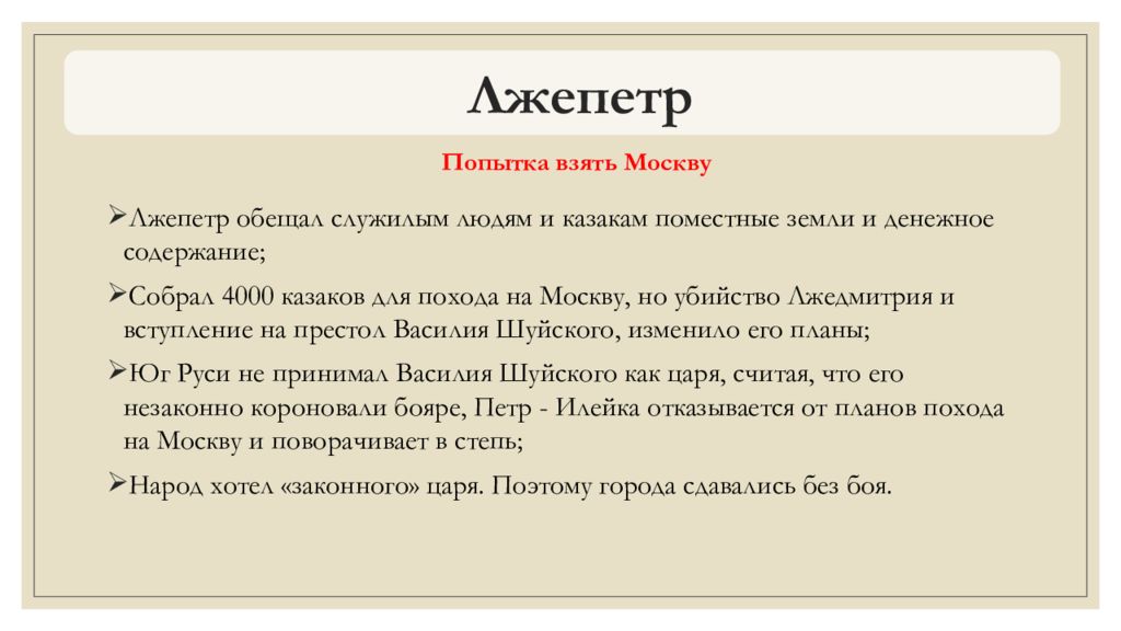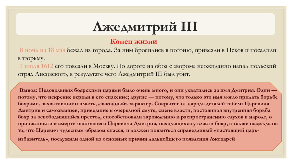 Конец жизни В ночь на 18 мая бежал из города. За ним бросились в погоню, привезли в Псков и посадили в тюрьму. 1 июля 1612 его повезли в Москву. По дороге на обоз с «вором» неожиданно напал польскии ̆ отряд Лисовского, в результате чего Лжедмитрий III был убит. Вывод: Недовольных боярскими царями было очень много, и они ухватились за имя Дмитрия. Одни — потому, что искренне верили в его спасение; другие — потому, что только это имя могло придать борьбе боярами, захватившими власть, «законный» характер. Сокрытие от народа деталей гибели Царевича Дмитрия и самозванцев, приведшие к очередной смуте, смене власти, постоянная внутренняя борьба бояр за освободившийся престол, способствовали зарождению и распространению слухов в народе, о причастности к смерти настоящего Царевича Дмитрия, находящихся у власти бояр, а также надежда на то, что Царевич чудесным образом спасся, и должен появиться справедливый «настоящий царь-избавитель», послужили одной из основных причин дальнейшего появления Лжецарей Лжедмитрий III