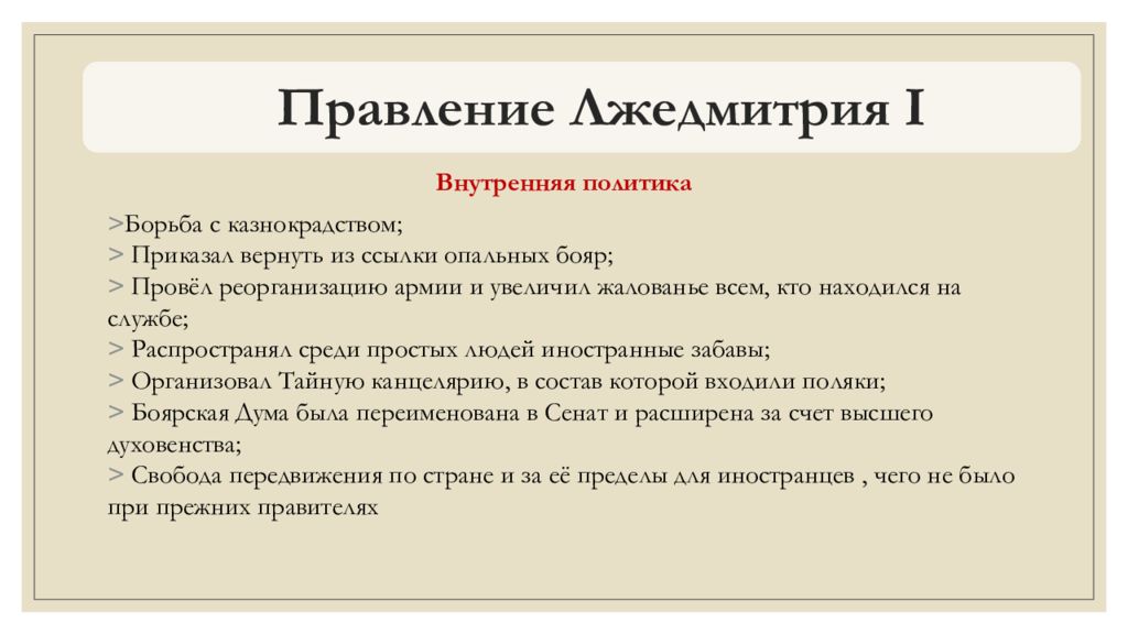 Внутренняя политика > Борьба с казнокрадством; > Приказал вернуть из ссылки опальных бояр; > Провёл реорганизацию армии и увеличил жалованье всем, кто находился на службе; > Распространял среди простых людей иностранные забавы; > Организовал Тайную канцелярию, в состав которой входили поляки; > Боярская Дума была переименована в Сенат и расширена за счет высшего духовенства; > Свобода передвижения по стране и за её пределы для иностранцев, чего не было при прежних правителях