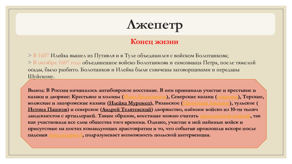 > В 1607 Илейка вышел из Путивля и в Туле объединился с войском Болотникова ; > В октябре 1607 года объединенное войско Болотникова и самозванца Петра, после тяжелои ̆ осады, было разбито. Болотников и Илейка были схвачены заговорщиками и переданы Шуйскому. Вывод: В России начиналось антибоярское восстание. В нем принимали участие и крестьяне и казаки и дворяне: Крестьяне и холопы ( Иван Болотников ), Северские казаки ( севрюки ), Терские, волжские и запорожские казаки ( Илейка Муромец ), Рязанское ( Прокопий Ляпунов ), тульское ( Истома Пашков ) и северское ( Андрей Телятевский ) дворянство, наёмное войско из 10-ти тысяч ландскнехтов с артиллерией. Таким образом, восстание можно считать гражданской войной, так как участвовали все слои общества того времени. Однако, участие в ней наёмных войск и присутствие на постах командующих аристократии и то, что события произошли вскоре после падения Лжедмитрия I, подразумевает возможность польской интервенции.