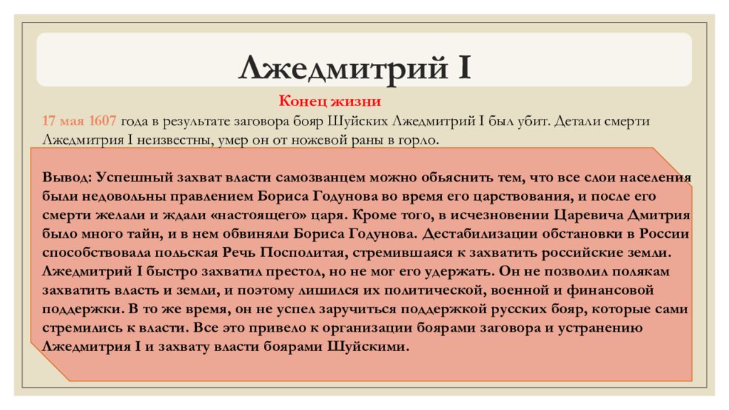 Конец жизни 17 мая 1607 года в результате заговора бояр Шуйских Лжедмитрий I был убит. Детали смерти Лжедмитрия I неизвестны, умер он от ножевой раны в горло. Вывод: Успешный захват власти самозванцем можно обьяснить тем, что все слои населения были недовольны правлением Бориса Годунова во время его царствования, и после его смерти желали и ждали «настоящего» царя. Кроме того, в исчезновении Царевича Дмитрия было много тайн, и в нем обвиняли Бориса Годунова. Дестабилизации обстановки в России способствовала польская Речь Посполитая, стремившаяся к захватить российские земли. Лжедмитрий I быстро захватил престол, но не мог его удержать. Он не позволил полякам захватить власть и земли, и поэтому лишился их политической, военной и финансовой поддержки. В то же время, он не успел заручиться поддержкой русских бояр, которые сами стремились к власти. Все это привело к организации боярами заговора и устранению Лжедмитрия I и захвату власти боярами Шуйскими. Лжедмитрий I