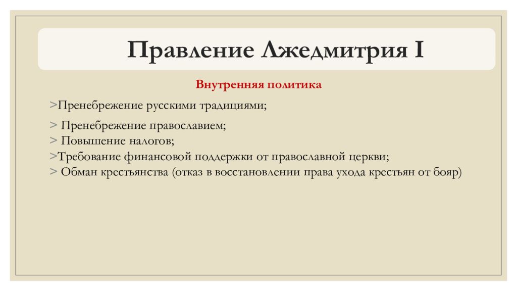 Внутренняя политика > Пренебрежение русскими традициями; > Пренебрежение православием; > Повышение налогов; > Требование финансовой поддержки от православной церкви; > Обман крестьянства (отказ в восстановлении права ухода крестьян от бояр)