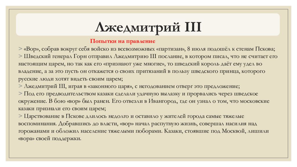 Попытки на правление > «Вор», собрав вокруг себя войско из всевозможных «партизан», 8 июля подошёл к стенам Пскова; > Шведскии ̆ генерал Горн отправил Лжедмитрию III послание, в котором писал, что не считает его настоящим царем, но так как его «признают уже многие», то шведскии ̆ король даёт ему удел во владение, а за это пусть он откажется о своих притязаний в пользу шведского принца, которого русские люди хотят видеть своим царем; > Лжедмитрий III, играя в «законного царя», с негодованием отверг это предложение; > Под его предводительством казаки сделали удачную вылазку и прорвались через шведское окружение. В бою «вор» был ранен. Его отвезли в Ивангород, где он узнал о том, что московские казаки признали его своим царем; > Царствование в Пскове длилось недолго и оставило у жителеи ̆ города самые тяжелые воспоминания. Добравшись до власти, «вор» начал распутную жизнь, совершал насилия над горожанами и обложил население тяжелыми поборами. Казаки, стоявшие под Москвои ̆, лишили «вора» своей поддержки. Лжедмитрий III