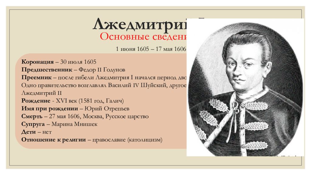 Коронация – 30 июля 1605 Предшественник – Федор II Годунов Преемник – после гибели Лжедмитрия I начался период двоевластия. Одно правительство возглавлял Василий IV Шуйский, другое – Лжедмитрий II Рождение - XVI век (1581 год, Галич) Имя при рождении – Юрий Отрепьев Смерть – 27 мая 1606, Москва, Русское царство Супруга – Марина Мнишек Дети – нет Отношение к религии – православие (католицизм) Основные сведения 1 июня 1605 – 17 мая 1606