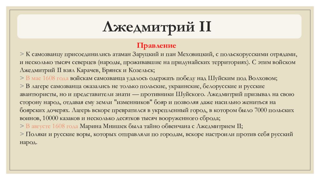 Правление > К самозванцу присоединились атаман Заруцкии ̆ и пан Меховицкии ̆, с польскорусскими отрядами, и несколько тысяч северцев (народы, проживавшие на придунайских территориях). С этим войском Лжедмитрий II взял Карачев, Брянск и Козельск; > В мае 1608 года войскам самозванца удалось одержать победу над Шуйским под Волховом; > В лагере самозванца оказались не только польские, украинские, белорусские и русские авантюристы, но и представители знати — противники Шуйского. Лжедмитрий призывал на свою сторону народ, отдавая ему земли "изменников" бояр и позволяя даже насильно жениться на боярских дочерях. Лагерь вскоре превратился в укрепленныи ̆ город, в котором было 7000 польских воинов, 10000 казаков и несколько десятков тысяч вооруженного сброда; > В августе 1608 года Марина Мнишек была тайно обвенчана с Лжедмитрием II; > Поляки и русские воры, которых отправляли по городам, вскоре настроили против себя русскии ̆ народ. Лжедмитрий II
