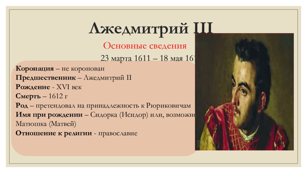 Основные сведения 23 марта 1611 – 18 мая 1612 Коронация – не коронован Предшественник – Лжедмитрий II Рождение - XVI век Смерть – 1612 г Род – претендовал на принадлежность к Рюриковичам Имя при рождении – Сидорка (Исидор) или, возможно, Матюшка (Матвей) Отношение к религии - православие Лжедмитрий III