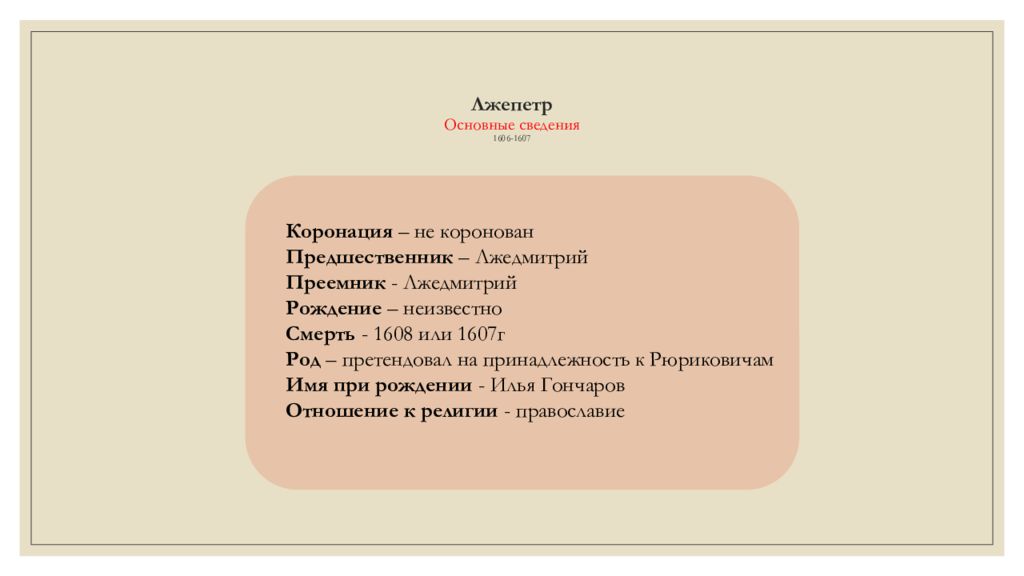 Слайд 17: Лжепетр Основные сведения 1606-1607