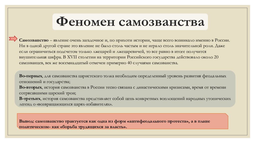 Самозванство – явление очень загадочное и, по прихоти истории, чаще всего возникало именно в России. Ни в одной другой стране это явление не было столь частым и не играло столь значительной роли. Даже если ограничиться подсчетом только лжецарей и лжецаревичей, то все равно в итоге получится внушительная цифра. В XVII столетии на территории Российского государства действовало около 20 самозванцев, век же восемнадцатый отмечен примерно 40 случаями самозванства. Во-первых, для самозванства царистского толка необходим определенный уровень развития феодальных отношений и государства; Во-вторых, история самозванства в России тесно связана с династическими кризисами, время от времени сотрясавшими царский трон; В-третьих, история самозванства представляет собой цепь конкретных воплощений народных утопических легенд о «возвращающихся царях-избавителях». Вывод: самозванство трактуется как одна из форм «антифеодального протеста», а в плане политическом- как «борьба трудящихся за власть».