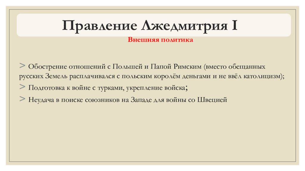 Внешняя политика > Обострение отношений с Польшей и Папой Римским (вместо обещанных русских Земель расплачивался с польским королём деньгами и не ввёл католицизм); > Подготовка к войне с турками, укрепление войска ; > Неудача в поиске союзников на Западе для войны со Швецией